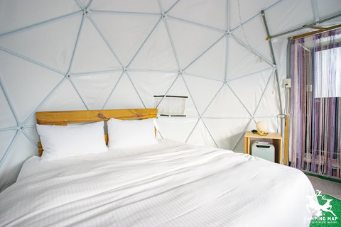 我們這次預定的是雙人球帳,帳篷配色溫暖、形狀圓潤,乍看就像森林系小精靈的家。不用自己搭帳篷、也不用準備床墊,帳內就直接配置了舒適的雙人床、空調和串燈,更棒的是有內建衛浴設備,不用擔心洗完澡還要穿越草叢。