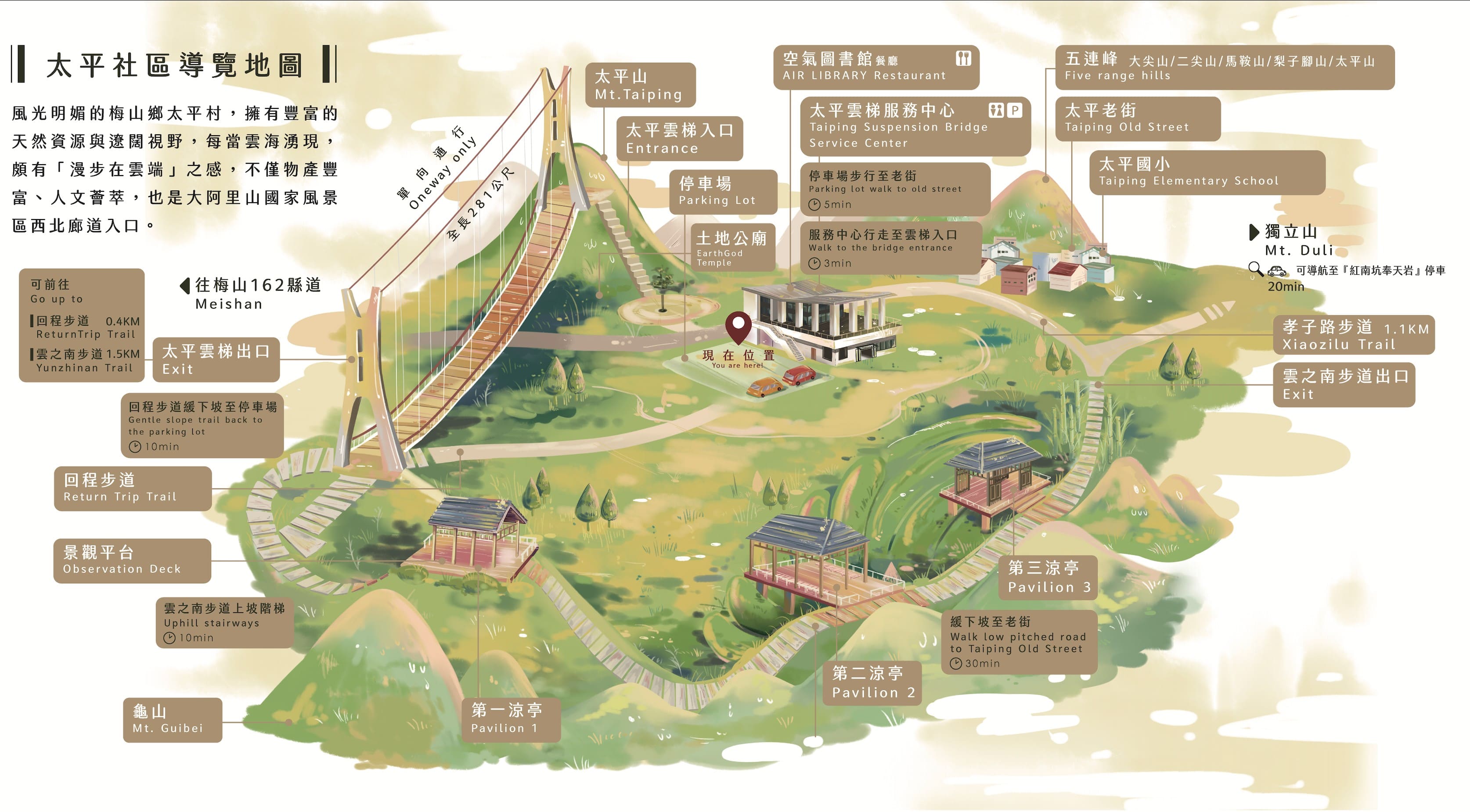 梅山太平雲梯附近景點非常多,像是梅子元氣館、太平老街、空氣圖書館、雲之南道、三元宮、竹林茶坊-孝子路步道都是附近非常值得一去的景點。